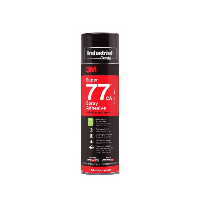 Adhesivo multiusos en aerosol Super 77 de la marca 3M. Transparente, multiusos, actúa rápido y une variedad gama de materiales ligeros. Su potente pegajosidad proporciona un agarre inicial elevado y suficiente tiempo abierto para colocar los materiales de forma adecuada. Gracias a su alto contenido en sólidos, su nivel de empapado es bajo y da tiempo para ajustar la posición de las piezas.