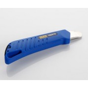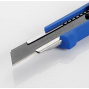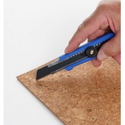 Cúter con mango de plástico ABS recubierto de goma TPR, rígido, ergonómico y antideslizante. Guías metálicas de acero inoxidable de 0,8 mm para garantizar una mayor robustez y precisión al cortar. Cuchilla de acero SK2H de 18mm y fragmentable en 8 filos de corte aprovechable para conseguir una mayor eficiencia y durabilidad. El acero SK2H, quintuplica la precisión de corte y triplica la vida útil. El cúter tiene una ruleta de seguridad para bloquear la cuchilla y un almacén para 2 cuchillas.