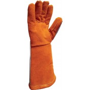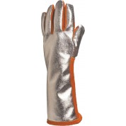Guante térmico TERK400 T-10 de la marca Delta Plus. Es un guante de soldadura diseñado para ofrecer una alta protección contra el calor radiante, el contacto con llamas y las proyecciones de metal fundido. Está compuesto por una palma de piel serraje vacuno con tratamiento anticalórico THT, un dorso de Kevlar Preox aluminizado y un forro de lana, lo que proporciona una excelente resistencia térmica y comodidad durante su uso prolongado. El guante se cosió con hilo Kevlar, aumentando su durabilidad y resistencia a los riesgos mecánicos. Este guante está recomendado específicamente para trabajos de soldadura TIG, así como para actividades como el vaciado, moldeado y forja de metales en fusión. Cumple con múltiples normativas de seguridad, incluyendo la categoría II, y está certificado según EN 420:2003-A1, EN 388, EN 407 y EN 12477/A1 Tipo A.