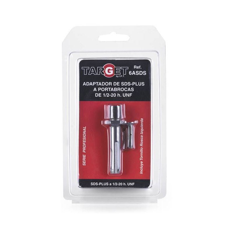 Adaptador portabrocas para SDS-Plus 6ASDS con rosca 1/2-20 hilos. UNF de la marca Target by I.P.T. Incluye tornillo rosa izquierda. Presentación en blister.