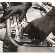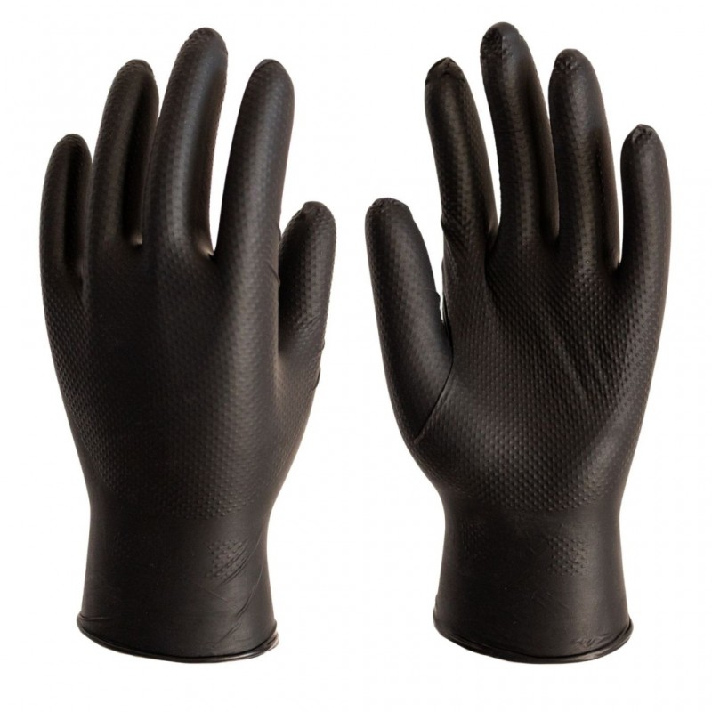 Guante desechable de nitrilo negro sin polvo con alto nivel resistencia tanto a la perforación como al rasgado y acabado en forma de diamante en todo el guante que mejora exponencialmente el agarre para el usuario. Fabricado sin proteínas de látex elimina el riesgo de alergias en personas sensibles a la proteína del látex. Ofrece una alta resistencia a grasas y aceites así como a productos químicos. El borde enrollado mejora la resistencia a líquidos evitando el goteo. AQL 1,5. Espesor pared sencilla 0.12 mm. Largo: 24 cm.