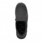 Zapato tipo mocasín en microfibra negra, antimicrobiano, ergonómico y con cierre ajustable para un rápido calce-descalce. Especialmente destinado a su uso por la industria alimentaria, limpieza, laboratorios, sanitario, etc.