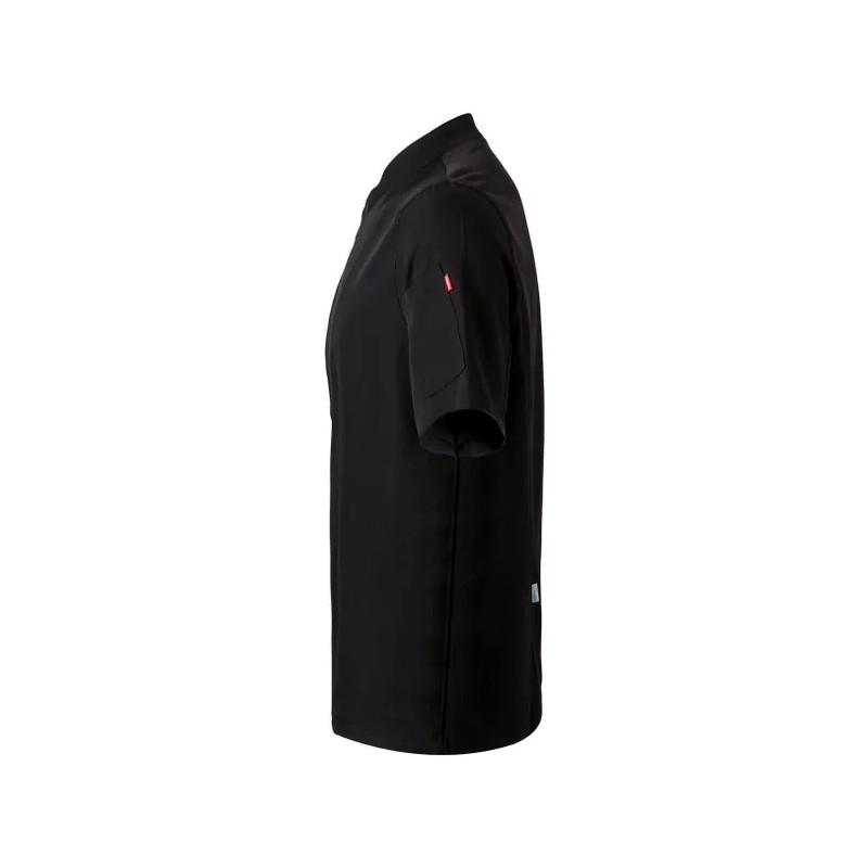 Chaqueta de cocina de manga corta en microfibra modelo 405209 de la marca Velilla. Chaqueta de cocina en tejido con tratamiento antibacterias y repelente de líquidos. Chaqueta de manga corta tipo sastre. Cierre central asimétrico, con botones automáticos ocultos. Cuello de tirilla. Espalda con tejido transpirable Coolmax®, de una sola pieza. Chaqueta con 1 bolsillos de parche en la manga izquierda con dos compartimentos. Chaqueta de cocina transpirable confeccionada en tejido microfibra 100% poliéster. 140 GSM
