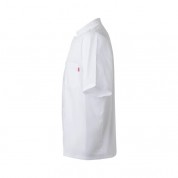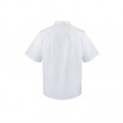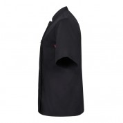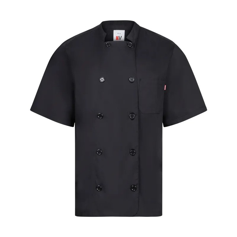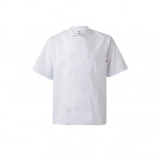 Chaqueta de cocina de manga corta modelo 405201 en popelín de la marca Velilla. Cierre central con doble botonadura cruzado. Cuello tirilla. Sin costura lateral. Chaqueta de cocina con 1 bolsillo de parche en el pecho. Chaqueta confeccionada en popelín 65% poliéster, 35% algodón. 110 GSM