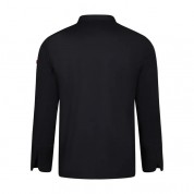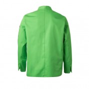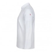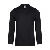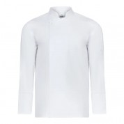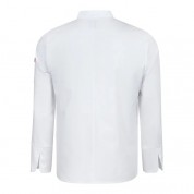 Chaqueta cocina manga larga hombre modelo 405202TC de la marca Velilla. Chaqueta con cierre central asimétrico, con cremallera oculta y botón. Manga larga tipo sastre con abertura en los puños. Cuello mao. Sin costura lateral. chaqueta con 1 bolsillo de parche en manga izquierda. Chaqueta en tejido sarga 65% poliéster, 35% algodón. 190 GSM